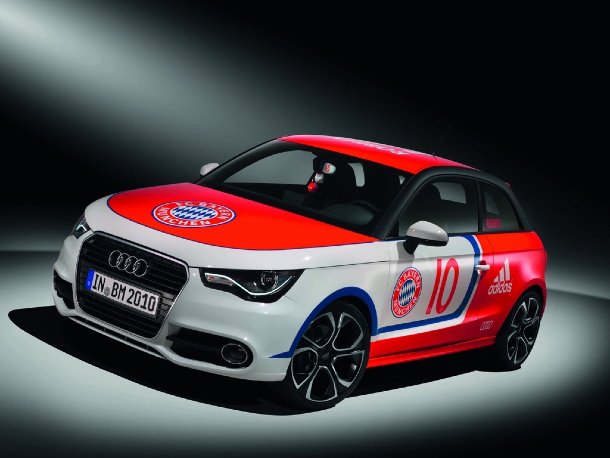 Beginnen wir mit dem FC Bayern München-Mottofahrzeug. Pünktlich zum wahrscheinlichen 22. Bundesliga-Titel des Vereins verwandelt Audi einen A1 mittels Klebefolie in ein überdimensionales Bayerntrikot mit der Rückennummer 10 von Topspieler Arjen Robben. Front und Heck zieren die Schürzen des S-Line-Pakets. Auch im Innenraum wird mittels lackierter und folierter Sitzrückenlehnen der Bezug zum Fußballclub, den Audi als Fahrzeugausrüster unterstützt, geschaffen.