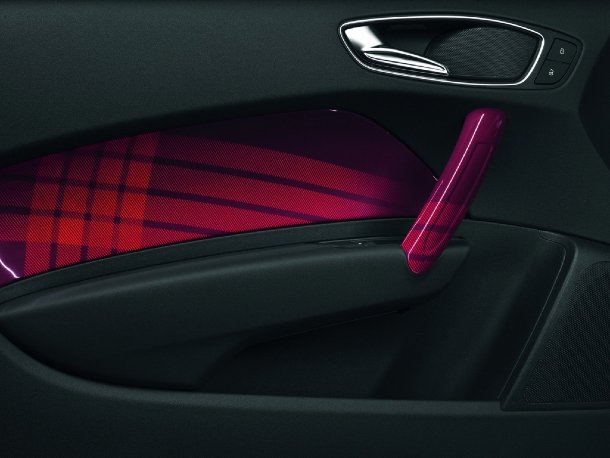 Mit dem A1 Fashion-Mottofahrzeug zeigt Audi die Möglichkeit, aus dem Kleinwagen einen luxuriösen Komfortgleiter mit edlem Exterieur zu machen. Im neuen Modefarbton Aubergine, der sich auf matten und glänzenden Flächen abwechselt, präsentiert sich an diesem Fahrzeug auch die Möglichkeit, den Dachbogen durch Musterfolien zu individualisieren.