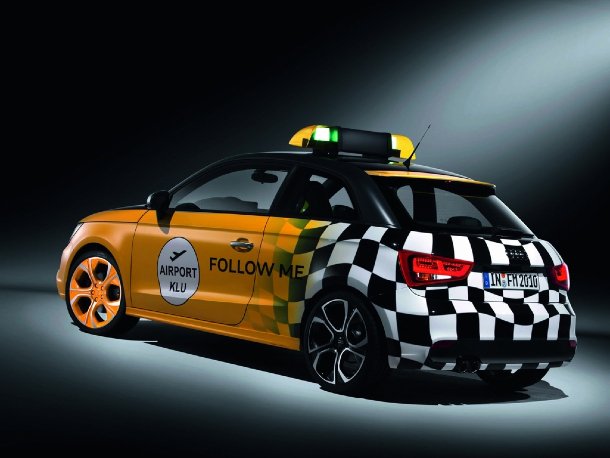 Ebenfalls mittels Klebefolie entstand ein „Follow Me“-Fahrzeug im Stile der gleichlackierten Wagen auf Flughäfen in aller Welt. Definitiv würde sich der A1 in dieser Aufgabe recht gut machen. Man stelle sich einen Airbus A380 vor, der dem A1 Follow Me-Car zu seiner Parkposition folgt. Neben dem auch hier verbauten S-Line-Paket finden sich an der Vorderachse in Wagenfarbe lackierte Felgen. Ob diese Option den Weg in die Ausstattungslisten schaffen wird, ist bislang noch nicht bekannt. Die ebenfalls in Wagenfarbe gehaltenen Tachoscheiben sind dabei eher denkbar.