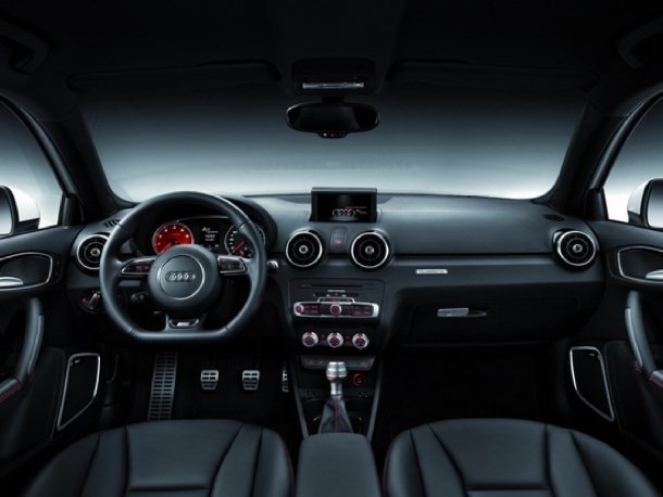 Im Interieur dominiert die Farbe schwarz, die sich über das Seidennappa-Leder der Sitze und der Armauflagen in den Türtafeln auf das Armaturenbrett und den Teppich überträgt. Durch rote Ziernähte wird ein bewusster Kontrast gesetzt. Vorn sind S-Sportsitze mit ausgeprägten Sitzwangen und integrierten Kopfstützen verbaut, auf deren lackierter Rückseite der quattro-Schriftzug zu finden ist. Hinter dem unten abgeflachten Multifunktions-Sportlenkrad huschen weiße Zeiger über Tacho- und Drehzahlmesser-Skalen, die sich für das Tempo in klassischem schwarz, für die Drehzahlen jedoch in auffälligem rot präsentieren. In der unteren Aluminiumspange des Lenkrads ist die Limitierungsnummer des A1 quattro angegeben. Auch der Schalthebel des manuellen Sechsgang-Getriebes ist aus Aluminium gefertigt.
