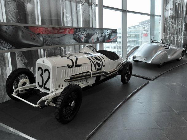 Ebenso gehört natürlich der Rennsport untrennbar zur Historie des Hauses mit den vier Ringen. Nicht nur die legendären Silberpfeile aus der Sonderausstellung sind da ein gutes Beispiel, auch noch ältere Fahrzeuge wie ein NSU Renner oder der Nachbau eines Wanderer „Lüttich-Rom-Lüttich“-Rennfahrzeugs zeigen, dass man bereits früh auf Rennsport zu Marketingzwecken setzte.