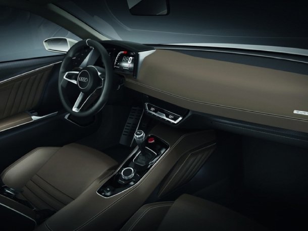 Das Interieur zeigt sich Audi-untypisch äußerst sachlich und aufgeräumt. Nur eine Anzeige hinter dem Lenkrad, auf der neben Tempo und Drehzahl werden hier auch die Inhalte des MMI-Systems eingeblendet. Auf Knopfdruck verändert das Display sein Aussehen und immitiert den Tacho des Ur-quattro. Rechts und links vom Display finden sich – wie beim Vorbild – je vier Tasten, mit denen sich Einfluß auf die angezeigten Informationen nehmen lässt.