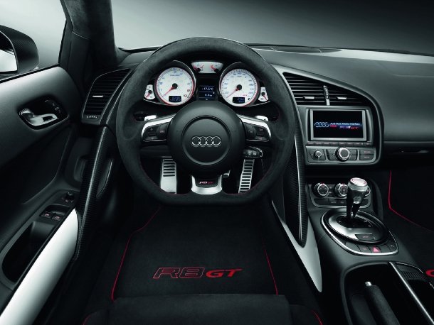 Trotz der Gewichtseinsparung muss der Fahrer nicht auf gewohnte Komfortausstattungen im Innenraum verzichten. Der R8 GT verfügt serienmäßig sowohl über eine Klimaautomatik, als auch über ein Navigationssystem oder elektrische Fensterheber. Auch die Musik kommt nicht zu kurz und kann optional auf ein Bang & Olufsen-System aufgestockt werden. Auch die Materialien entsprechen dem von Audi erwarteten Standard und vereinen sportliche Optik mit feinen Details. Schwarz und dunkelgrau überwiegen, werden jedoch durch die weißen Tachoscheiben und rote Kontrastnähte passend akzentuiert. Dazu kommen an vielen Stellen Elemente aus Kohlefaser, sowie Sicherheitsgurte, die wahlweise in rot, orange oder grau geliefert werden. Auf dem Schalthebel findet sich eine Plakette mit der laufenden Limitierungsnummer.