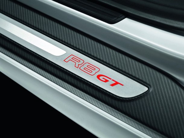 Seitlich fallen die Blades in mattem Carbon auf. Auch die kleineren Spiegelgehäuse sind aus dem Verbundmaterial hergestellt. Hinter den Vorderrädern verraten kleine GT-Schriftzüge dem Passanten, dass es sich bei diesem Fahrzeug um die Topversion handelt. Am Heck finden sich die größten Änderungen gegenüber der Basis. Ein feststehender Carbon-Heckflügel und Luftauslässe hinter den Hinterrädern wären ebenso zu nennen, wie neue Luftauslassgitter in der Heckschürze, die, wie oben bereits erwähnt, auch aus Kohlefaser besteht. Gegenüber dem R8 V10 wurde der Diffusor noch einmal vergrößert.