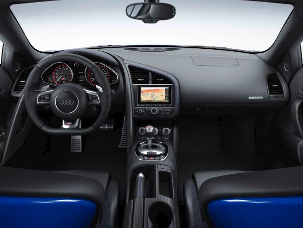Schwarzes Feinnappa-Leder wird im Cockpit des Audi R8 LMX mit blauen Akzenten gekonnt verbunden.