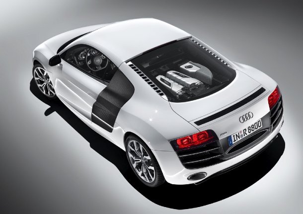 Beim Fahren baut der Hochleistungssportwagen von Audi Abtrieb auf, der ihn an die Straße saugt – dank des bei 100 km/h selbsttätig ausfahrenden Heckspoilers und des voll verkleideten Unterbodens, der in einen weit nach oben gezogenen Diffusor mündet. Am Heck dominiert hochglänzendes Schwarz; auch die LED-Rückleuchten sind dunkel eingefärbt. Die hinteren Luftöffnungen tragen ebenfalls nur zwei Querstege, und die