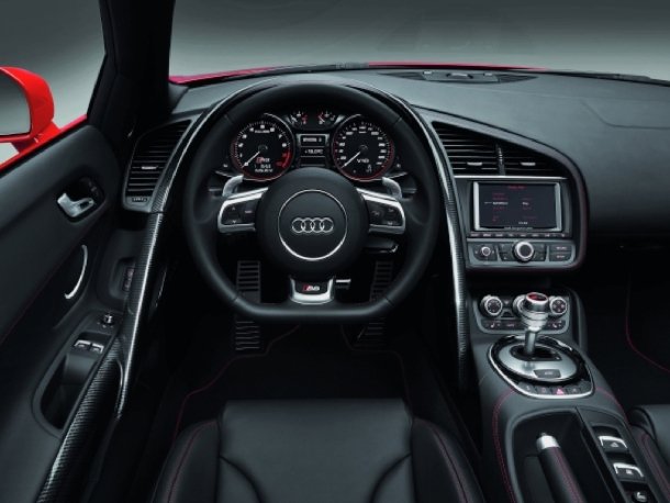 Hinter den Passagieren kommt der bekannte 5,2 Liter große V10-Motor zum Einsatz, der beim Plus-Modell ab Werk eine Beleuchtung in der Carbon-Umrandung erhält. Im R8 Plus darf man sich über ein Leistungsplus von 25 PS gegenüber dem normalen V10-Modell freuen. Somit stehen hier 404 kW/550 PS und ein maximales Drehmoment von 540 Newtonmetern zur Verfügung, die über das neue Siebengang-S-Tronic-Direktschaltgetriebe auf den permanenten quattro-Allradantrieb übertragen werden. Auf Wunsch gibt es den Audi R8 Plus auch mit einem Sechsgang-Schaltgetriebe. Nach nur 3,5 Sekunden fällt die 100 km/h-Markierung im Tacho, spätestens bei Tempo 317 bleibt die Nadel andächtig stehen – sofern Auslauf und Verkehrssituation dies zulassen.