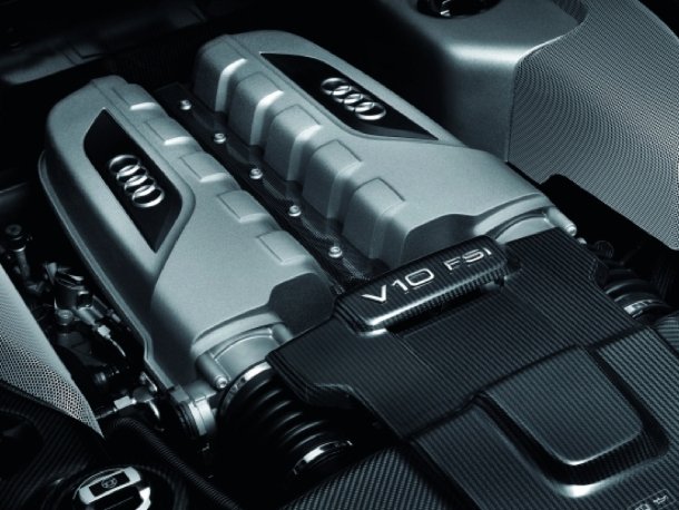 Hinter den Passagieren kommt der bekannte 5,2 Liter große V10-Motor zum Einsatz, der beim Plus-Modell ab Werk eine Beleuchtung in der Carbon-Umrandung erhält. Im R8 Plus darf man sich über ein Leistungsplus von 25 PS gegenüber dem normalen V10-Modell freuen. Somit stehen hier 404 kW/550 PS und ein maximales Drehmoment von 540 Newtonmetern zur Verfügung, die über das neue Siebengang-S-Tronic-Direktschaltgetriebe auf den permanenten quattro-Allradantrieb übertragen werden. Auf Wunsch gibt es den Audi R8 Plus auch mit einem Sechsgang-Schaltgetriebe. Nach nur 3,5 Sekunden fällt die 100 km/h-Markierung im Tacho, spätestens bei Tempo 317 bleibt die Nadel andächtig stehen – sofern Auslauf und Verkehrssituation dies zulassen.