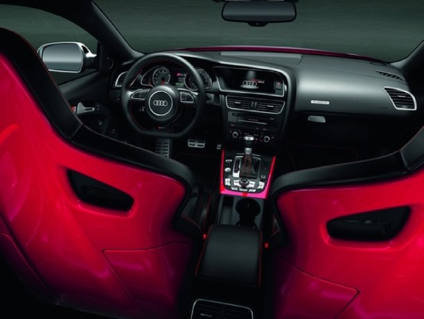 Innen wird die Fahrzeugbesatzung vom Audi-typischen edlen Materialmix aus Leder, Alcantara, Aluminium und Carbon erwartet, der optional noch durch Feinnappa-Leder aufgewertet werden kann. Ein neues Multifunktionslenkrad mit unten abgeflachtem Kranz sorgt für einen guten Kontakt zwischen Fahrer und Straße. Ebenso wurden die Lenkstockhebel und der Wählhebel der S-Tronic überarbeitet. In das serienmäßige Fahrerinformationssystem sind beim RS 5 ein Ölthermometer und eine Rundenzeiten-Funktion eingebunden, die Rennstrecken-Fahrern mit Sicherheit Spaß machen wird. Durch ein reichhaltiges Sonderausstattungs-Angebot können Interessenten ihren neuen Audi RS 5 zu einem individuellen Unikat machen.