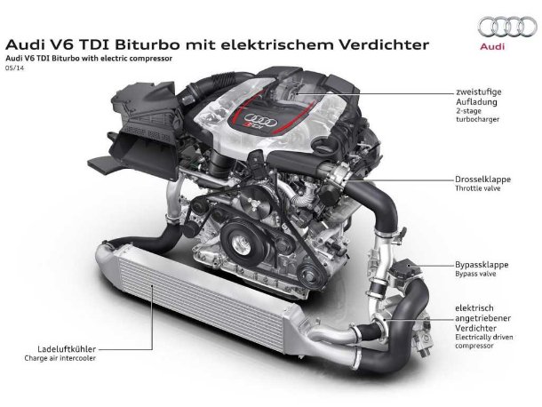 Als Antriebseinheit steckt unter der Haube des RS 5 Coupés ein 3 Liter großer V6-Dieselmotor, der in gewohnter Weise von zwei Abgasturboladern unter Druck gesetzt wird. Neu ist hingegen ein Elektro-Turbolader, der speziell beim Anfahren und aus niedrigen Drehzahlregionen heraus zugeschaltet wird und gezielt Luft in die beiden Turbos bläst. Dazu beschleunigt ein Elektromotor das Verdichterrad des Elektro-Turbos innerhalb von wenigen Hunderstelsekunden auf rund 70.000 Umdrehungen pro Minute. Die dadurch erzeugte Ladeluft wird in die eigentlichen Turbos gepresst und löscht das altbekannte Turboloch gänzlich aus.