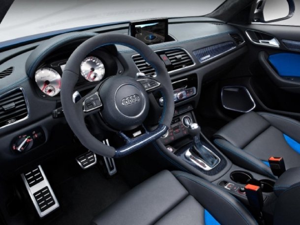 Fahrer und Beifahrer erleben die wilde Hatz in gut ausgeformten Schalensitzen, die wie das gesamte Interieur mit schwarzem Leder in Kombination mit blauem Alcantara bezogen sind. Die Dekorleisten zeigen sich in Sichtcarbon, in das bei der Produktion leuchtend blau eingefärbte Glasfasern eingearbeitet wurde. Da der Audi RS Q3 seine Weltpremiere auf der Motorshow in Peking erlebt, wurden die sonst üblichen arabischen Ziffern des Drehzahlmessers gegen chinesische ausgetauscht. Blaue Kontrastnähte runden den sportlichen Auftritt gekonnt ab.
