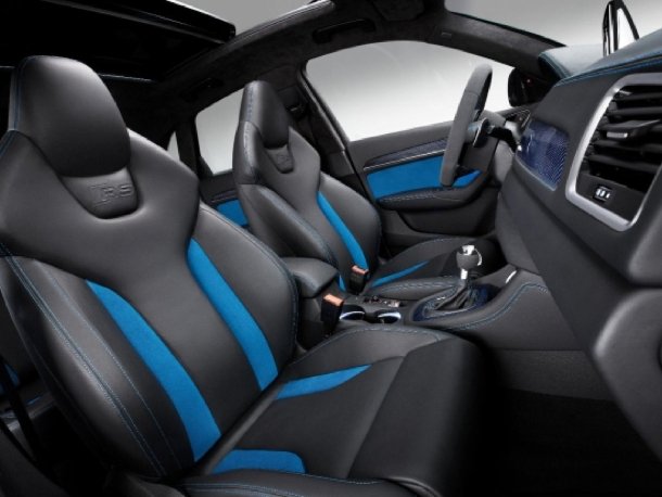 Fahrer und Beifahrer erleben die wilde Hatz in gut ausgeformten Schalensitzen, die wie das gesamte Interieur mit schwarzem Leder in Kombination mit blauem Alcantara bezogen sind. Die Dekorleisten zeigen sich in Sichtcarbon, in das bei der Produktion leuchtend blau eingefärbte Glasfasern eingearbeitet wurde. Da der Audi RS Q3 seine Weltpremiere auf der Motorshow in Peking erlebt, wurden die sonst üblichen arabischen Ziffern des Drehzahlmessers gegen chinesische ausgetauscht. Blaue Kontrastnähte runden den sportlichen Auftritt gekonnt ab.