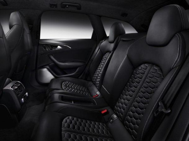 Im schwarz gehaltenen Interieur fallen vor allem das unten abgeflachte Dreispeichen-Multifunktionslenkrad, die Aluminium-Pedalerie und die Dekorblenden in Sichtcarbon auf. Auf den Sportsitzen findet sich ab Werk ein Mix aus Leder und Alcantara, während auf den Sitzflächen durch eine Rautensteppung das Wabenmuster des Kühlergrills wiederaufgenommen wird. Auf Wunsch gibt es Voll-Leder-Sitze und eine Dreier-Bank im Fond anstelle der zwei ausgeformten Sitzplätze. Beim starten zeigen die Bildschirme des Fahrer-Informations-Systems (FIS) zwischen den Rundinstrumenten und des MMI spezifische „RS 6“-Logos an. Im RS-Menü des FIS wurde eine Schaltanzeige integriert, die je nach Drehzahl grüne Balken einblendet und bei Drehzahlen nahe der Drehzahlgrenze einen roten Balken, der zur Erinnerung an den Schaltzeitpunkt aufflackert. Darüber hinaus lassen sich über das FIS die Öltemperatur, der eingelegte Gang, die Geschwindigkeit in digitalen Zahlen und der Ladedruck anzeigen.
