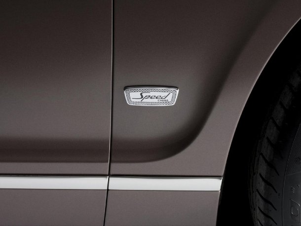 Von außen erkennt man den Flying Spur Speed China am Bentley-„B“ an den C-Säulen, sowie einer „Speed China“-Plakette hinter beiden Vorderrädern. Diese Plakette findet sich auch im Innenraum auf der Mittelkonsole wieder. Da dieses Fahrzeug sich, wie beschrieben, an Kunden richtet, die sich chauffieren lassen, verfügt das Fahrzeug ab Werk über ein Rearseat-Entertainment-Paket inklusive Bildschirmen auf der Rückseite der vorderen Kopfstützen, DVD-Player und kabellosen Kopfhörern für die Fond-Passagiere. Exklusiv für den Speed China gibt es lederbezogene Kissen, die mit dem Bentley-Logo bestickt sind. Leder- und Nahtfarbe sind dabei identisch mit denen des restlichen Fahrzeugs. Der Zündschlüssel des Wagens kommt in einer edlen Displaybox, die sich der Kunde wahlweise auch in die heimische Vitrine legen kann.