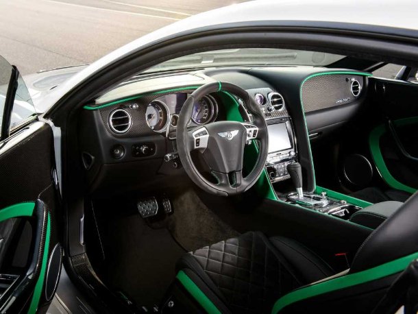 Speziell im Interieur zeigt sich, wo Bentley insgesamt 100 Kilogramm im Vergleich zum GT V8 S eingespart hat. Anstelle der Rückbank findet sich eine belederte Gepäckablage, die im oberen Bereich von einem Sichtcarbon-Element abgeschlossen wird. Weitere Sichtcarbon-Blenden ziehen sich über die Türpaneele, das Armaturenbrett, die Schwellerverkleidung und den Mitteltunnel. Die neu ausgeformten Sportsitze bieten deutlich mehr Seitenhalt und sind mit Beluga-farbigem Leder und Alcantara bezogen, wobei das Alcantara in Diamantsteppung ausgeführt wird. Auf den Kopfstützen ist der „GT3R“-Schriftzug eingestickt. Dieser findet sich zusätzlich als Emblem oberhalb des Handschuhfaches und auf den Einstiegsleisten. Grüne Lederelemente sorgen im gesamten Interieur für Kontrastpunkte.