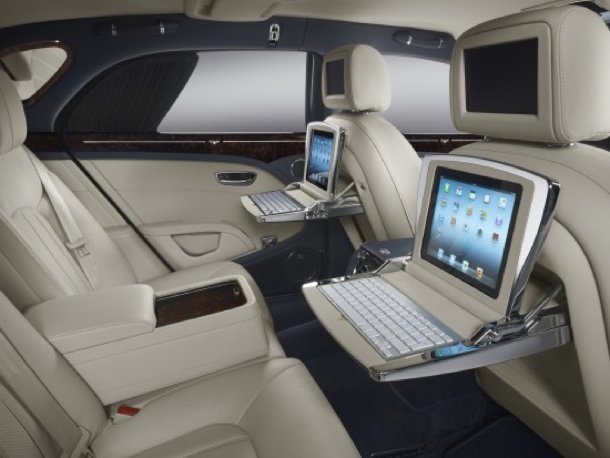 ...iPads und schnurlose Tastaturen verwandeln und machen den Mulsanne damit zum rollenden Büro. Dank WLAN-Hotspot und UMTS-Modul ist eine Internetverbindung während der Fahrt verfügbar.