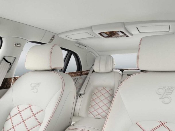Schon wenn man die Türen öffnet fällt der Blick auf die beleuchteten Einstiegsleisten mit „Ninety Five“-Schriftzügen. Dahinter geht es weiter ins Bentley-typisch mit viel Leder ausgekleidete Interieur, hier in den Farbtönen blau und weiß sowie mit roten Kontrastnähten versehen. Eine weitere Besonderheit sind die Holzdekorleisten. Wo sonst Edelhölzer aus aller Welt zu finden sind, wird in den 15 Exemplaren dieses Sondermodells das Holz vom gleichen, rund 400 Jahre alten Walnussbaum verwendet. Dieser fiel in einem schweren Sturm im Jahr 2007 in Fulbeck Hall in der Grafschaft Lincolnshire um.