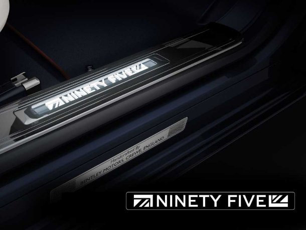 Schon wenn man die Türen öffnet fällt der Blick auf die beleuchteten Einstiegsleisten mit „Ninety Five“-Schriftzügen. Dahinter geht es weiter ins Bentley-typisch mit viel Leder ausgekleidete Interieur, hier in den Farbtönen blau und weiß sowie mit roten Kontrastnähten versehen. Eine weitere Besonderheit sind die Holzdekorleisten. Wo sonst Edelhölzer aus aller Welt zu finden sind, wird in den 15 Exemplaren dieses Sondermodells das Holz vom gleichen, rund 400 Jahre alten Walnussbaum verwendet. Dieser fiel in einem schweren Sturm im Jahr 2007 in Fulbeck Hall in der Grafschaft Lincolnshire um.