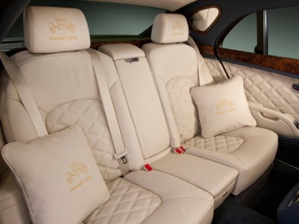 Um genau zu sein muss man davon wissen, um es zu entdecken: Die Karosseriehauptfarbe repräsentiert den roten Anteil der Flagge, während im Interieur mit weißem und blauem Leder gearbeitet wird, um auch die verbliebenen Flaggenfarben abzubilden. In alle vier Kopfstützen ist eine Mulliner-Kutsche in Kombination mit dem Schriftzug „Diamond Jubilee“ eingestickt. Dieses Motiv findet sich auch auf zwei beiliegenden Kissen für die Fondpassagiere, sowie als goldene Einlage unter dem Klarlack auf den aus Edelholz gefertigten Picknicktischen an der Rückseite der Vordersitze und auf dem Armaturenbrett. Die Sitzplätze und Türtafeln sind mit gestepptem weißen Leder bezogen, während Mitteltunnel, Armaturenbrett und Lenkrad in blau gehalten sind. Nach dem Öffnen der Türen fällt der Blick auf je zwei Metallplaketten, von denen die eine den Schriftzug „Bentley Mulliner, England“ trägt, während die Zweite durch die eingravierten Worte „Diamond Jubilee Edition“ auf das exklusive Sondermodell hinweist.