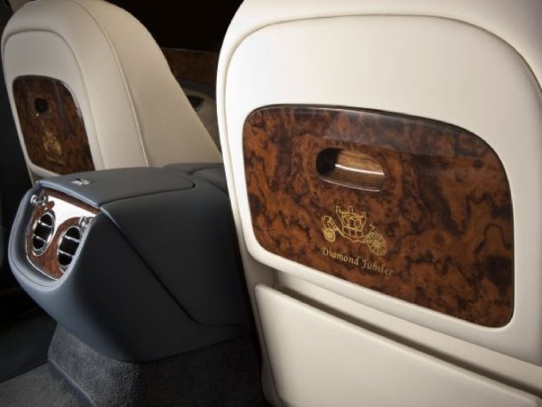 Um genau zu sein muss man davon wissen, um es zu entdecken: Die Karosseriehauptfarbe repräsentiert den roten Anteil der Flagge, während im Interieur mit weißem und blauem Leder gearbeitet wird, um auch die verbliebenen Flaggenfarben abzubilden. In alle vier Kopfstützen ist eine Mulliner-Kutsche in Kombination mit dem Schriftzug „Diamond Jubilee“ eingestickt. Dieses Motiv findet sich auch auf zwei beiliegenden Kissen für die Fondpassagiere, sowie als goldene Einlage unter dem Klarlack auf den aus Edelholz gefertigten Picknicktischen an der Rückseite der Vordersitze und auf dem Armaturenbrett. Die Sitzplätze und Türtafeln sind mit gestepptem weißen Leder bezogen, während Mitteltunnel, Armaturenbrett und Lenkrad in blau gehalten sind. Nach dem Öffnen der Türen fällt der Blick auf je zwei Metallplaketten, von denen die eine den Schriftzug „Bentley Mulliner, England“ trägt, während die Zweite durch die eingravierten Worte „Diamond Jubilee Edition“ auf das exklusive Sondermodell hinweist.