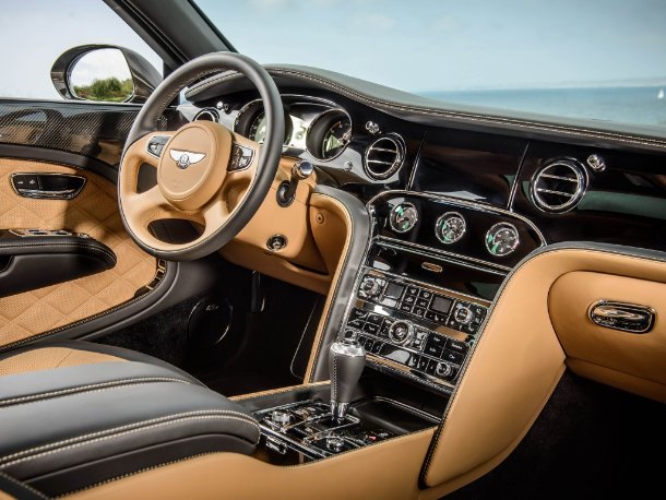 Für das Interieur des Mulsanne Speed stellte Bentley verschiedene Zweifarbkombinationen zusammen, die durch neue Nahtverläufe und Diamantsteppung modernen Stil mit zeitgenössischem Flair mischen. In die Dekorleisten mit schwarzem Klavierlack sind Einleger in Sichtcarbon integriert worden. Insgesamt stehen 24 Lederfarben zur Auswahl, die in sechs unterschiedlichen Kompositionen kombiniert werden können. Dazu gesellen sich zehn verschiedene Furnierarten für die Dekorleisten.
