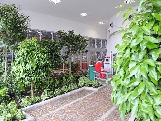 Anfang des Jahrtausends setzte man die „Formula Uomo“ (Formel Mensch) als Arbeitsmotto um und baute daraufhin komplett neue Hallen auf dem Werksgelände. Den Machern der berühmten Sportwagen sind nämlich nicht nur gute Produkte wichtig, sondern auch gesunde und motivierte Mitarbeiter. So wurde nach Möglichkeit jeder Arbeitsplatz mit Tageslicht ausgestattet. In den Hallen finden sich grüne Oasen mit Bäumen und Sträuchern. Und dabei handelt es sich nicht etwa um pflegeleichte Kunstpflanzen, sondern um wahre Natur, die nebenbei auch das Betriebsklima im wahrsten Sinne des Wortes verbessert.