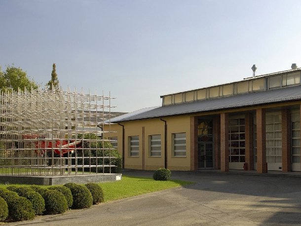 Keine 100 Meter weiter befindet sich ein weiteres futuristisches Gebäude. Hier wickelt Ferrari die gesamte Distribution rund um das werkseigene Rennteam ab. Die großen LKWs können in die Halle hineinfahren und ihre wertvolle Fracht trocken und ungesehen aus- oder einladen.