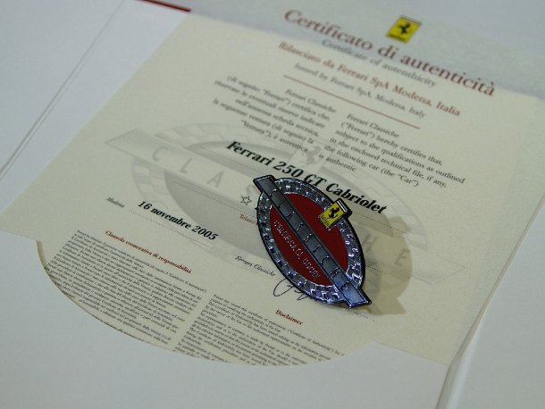 Wenn alle Daten aus dem Archiv mit dem vorgestellten Fahrzeug übereinstimmen, stellt Ferrari Classiche ein Echtheits-Zertifikat aus und vergibt eine Plakette, die sich der stolze Besitzer ans Auto setzen darf.