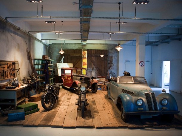Der Rundgang im Inneren beginnt schließlich vor einem Scheunenfund-Diorama. Hier sind Fahrzeuge so ausgestellt, wie sie überall auf der Welt tatsächlich in alten Scheunen, Garagen oder Hallen gefunden werden. Hierfür wurde extra leicht schummriges, gedämmtes Licht installiert, um die Atmosphäre, in der solche Autos über Jahre hinweg herumstehen, nachzuempfinden. Das 327 Sport Cabrio vorne rechts wurde der BMW Classic in diesem Zustand geschenkt, allerdings unter der Voraussetzung, dass es niemals restauriert wird. Das widerspricht zwar ein wenig den sonstigen Gepflogenheiten von BMW Classic, wo sonst alle Fahrzeuge nahezu dem Neuzustand entsprechen, aber „einem geschenkten Gaul…“