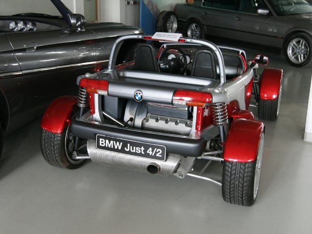 Eher unbekannt sind die Z-Fahrzeuge, die bei BMW intern als Versuchsträger dienen. Ab und an verirrt sich ein solcher Wagen mal auf eine Automesse und findet dort Beachtung, im Allgemeinen verschwinden sie jedoch nach den durchgeführten Tests auf den Prüfgeländen in den versteckten Hallen der Werkssammlung. In der BMW Classic hatten wir Gelegenheit, den Z18, einen hochgelegten Gelände-Roadster, und den Z21, besser bekannt als „Just 4/2“, zu sehen. Ja, richtig, der Wagen, der uns bereits oberhalb des Haupteinganges in dunkelblau begrüßt hatte, stand hier in einer zweiten, roten Ausfertigung noch einmal herum. Wenn man den Wagen so betrachtet ist es eigentlich schade, dass er nie den Weg auf die Straße gefunden hat. Mit seinem Heckmotor und der grenzenlos offenen Gestaltung dürfte er beinahe Motorrad-Feeling ins Automobil übertragen.