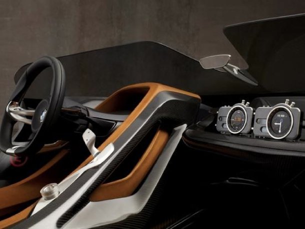 Das Interieur konzentriert sich klar auf’s Wesentliche und das ist bei einem solchen Roadster natürlich die schnelle Fahrt, am besten bei einem klassischen Straßenrennen wie der Mille Miglia. Um dort nicht nur um den goldenen Blumentopf mitzufahren, sondern eventuell gar um den Gesamtsieg zu kämpfen, benötigt man neben einer Stoppuhr vor allem einen Tripmaster, der dem Beifahrer genaueste Informationen über die zurückgelegte Wegstrecke gibt. Beides steht im 328 Hommage in Form von zwei iPhones bereit, die vor dem Copiloten in speziellen Aluminiumhalterungen montiert sind, die an klassische Stoppuhren erinnern. Dem Fahrer steht ein einziges Rundinstrument mit Kombianzeige zur Verfügung, auf dem wie beim historischen Vorbild lediglich die Drehzahl, Öltemperatur und -druck, sowie die Wassertemperatur angezeigt werden. Dazu gibt es ein paar Kontrollleuchten und eine Schaltpunktanzeige. Der restliche Innenraum wird durch braunes Leder und Sichtcarbon bestimmt, wodurch das sportlich-edle Exterieurdesign fortgesetzt wird. Moderne Vierpunktgurte und ein Notausschalter für die Elektronik bringen heutige Rennsport-Sicherheitstechnik in den 328 Hommage.
