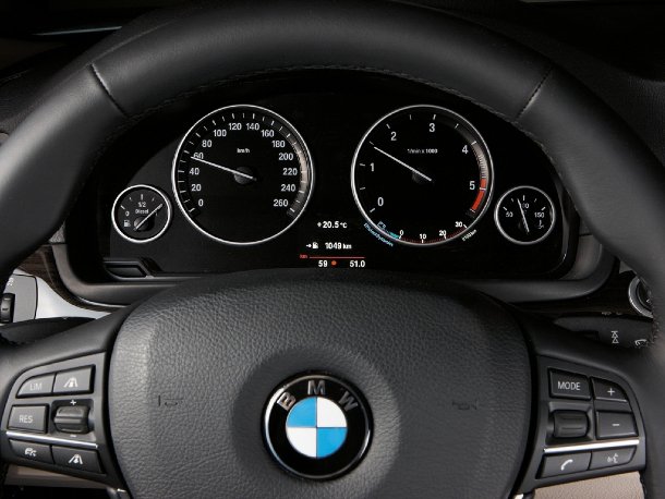 Im Innenraum besinnt man sich auf die glorreiche Vergangenheit der Marke und positioniert die wichtigsten Bedieneinheiten und die Displays wieder mehr Fahrer-orientiert. Eine erfreuliche Entwicklung. Natürlich kann in der heutigen Zeit keine luxuriöse Limousine mehr ohne Bordcomputer, Navi oder andere elektronische Spielzeuge in die Showrooms rollen. So auch der neue 5er nicht. Aus dem 7er wird das SurroundView-System übernommen, bei dem man mittels Kameras aus unübersichtlichen Straßen herausschauen kann, ohne dabei bereits mit dem halben Auto im fließenden Verkehr zu stehen. Die Rückfahrkamera und ein Parkassistent ermöglichen es wirklich jedem, rückwärts einzuparken, egal ob Männlein oder Fräulein. Der Tempomat ist mit einer Abstandsmessung und einem Auffahrwarner verbunden, der im Notfall die Bremsung einleitet, um einen Unfall zu verhindern. Überdies sind noch einige weitere Fahrerassistenz-Systeme wie Spurhalte-Assistent und das Nachtsichtgerät BMW Night Vision mit Personenerkennung im Programm.