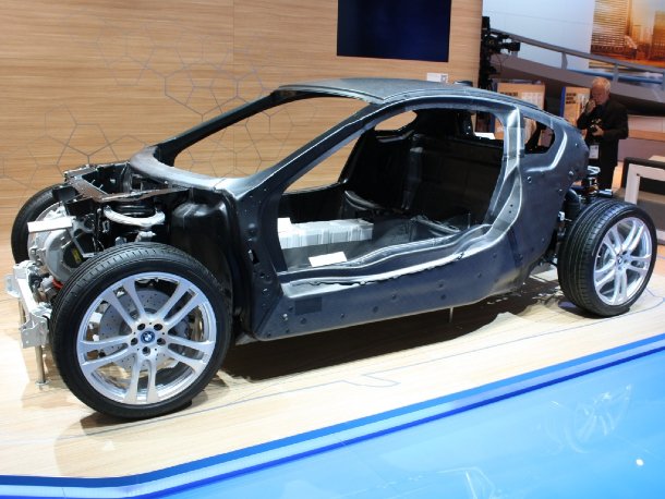 Die Basis des BMW i8 bildet ein Carbon-Monocoque in neuartiger Layering-Bauweise, durch die nach einem Unfall auch einzelne Elemente getauscht werden können.