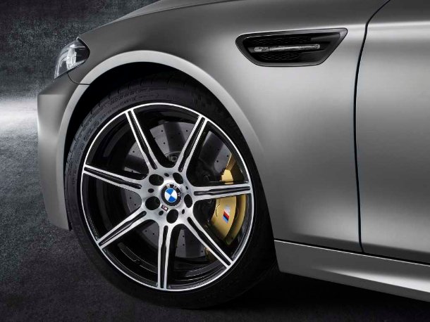 Auf Basis der fünften M5-Auflage rollt zum 30-jährigen Jubiläum nun ein exklusives Sondermodell zu den Händlern. Die Karosserie erhält eine Lackierung in Frozen Dark Silver metallic. Dazu passende, 20 Zoll große Leichtmetallräder mit schwarz lackiertem Felgenbett und glanzpoliertem Stern verbergen die Performance-Bremsanlage mit goldenen Sätteln. Alle Chromakzente sind schwarzverchromt, inklusive der seitlichen Luftauslässe im vorderen Kotflügel und der Auspuffendrohre.