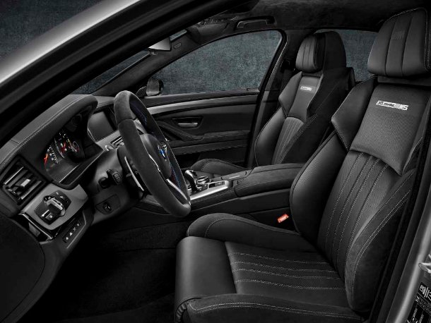 Schwarzes Merino-Leder und farblich abgestimmtes Alcantara überziehen Sitze, Armaturenbrett und Türpaneele. Passend dazu sind die Dekorblenden in dunkel eloxiertem Aluminium ausgeführt. Auf den Sitzlehnen und Einstiegsleisten finden sich ebenso Hinweise auf die 30 Jahre M5 Edition, wie an den Blenden der Luftauslässe in den vorderen Kotflügeln. Oberhalb des Handschuhfaches zeigt eine Plakette mit durchlaufender Nummerierung die Zugehörigkeit zur Jubiläumsauflage an.