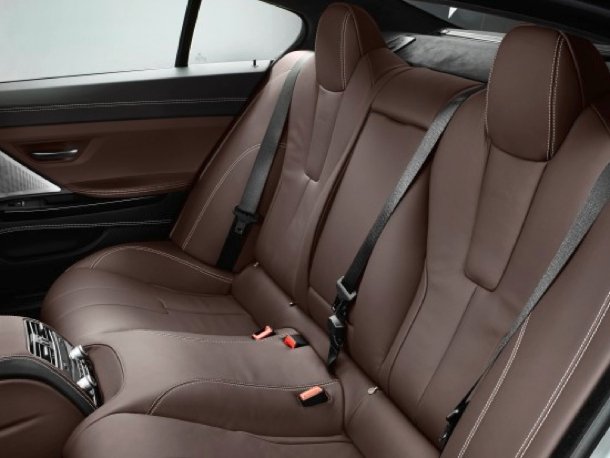 Diese Dachvertiefung wird im Interieur wieder aufgegriffen, indem der Alcantara-Dachhimmel an dieser Stelle eine Mittelbahn in Leder erhält. Im restlichen Innenraum ist serienmäßig die Lederausstattung Merino mit erweiterten Umfängen verbaut, die auch die beiden Sportsitze mit integrierten Gurten für Fahrer und Beifahrer umfasst. Für mehr Praktikabilität im Alltag lässt sich der 460 Liter fassende Gepäckraum durch das umlegen der Fondsitzbank auf bis zu 1.265 Liter erweitern. Zur weiteren Serienausstattung zählen das M Sportfahrwerk mit dynamischer Dämpferkontrolle, Sitzheizungen für Fahrer und Beifahrer, das Radio BMW Professional, eine Alarmanlage und automatisch abblendende Innen- und Außenspiegel. Gegen Aufpreis sind eine Vierzonen-Klimaautomatik, M-Multifunktionssitze, Sitzheizung im Fond, Soft-Close-Automatik für die Türen, schlüsselloser Komfortzugang, elektrische Sonnenrollos, eine Lenkradheizung, ein Bang & Olufsen High End Surround Sound System, das Navigationssystem Professional und eine Carbon-Keramik-Bremsanlage erhältlich. Auch die neuartigen Fahrassistenzsysteme wurden nicht vergessen und sind im M6 Gran Coupé im Angebot von BMW ConnectedDrive zusammengefasst. Dazu zählen unter anderem ein Head-Up-Display, eine Park Distance Control mit Rückfahrkamera, Fernlichtassistent oder Spurhalte-Assistent.