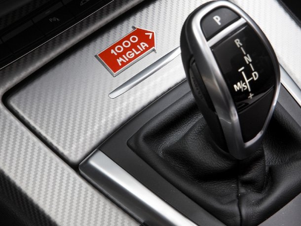 Auch der Innenraum wurde gezielt aufgewertet. Dekorleisten in silbernem Sichtcarbon, Sportsitze mit schwarzem Alcantara, Ledersitzwangen und roten Ziernähten im Rautenmuster unterstreichen die natürliche Sportlichkeit des Roadsters ebenso, wie eine Aluminiumfußstütze, Alcantara-Fußmatten mit roter Keder und Mille Miglia-Logo, sowie die exklusive Mille Miglia-Plakette auf der Mittelkonsole.
