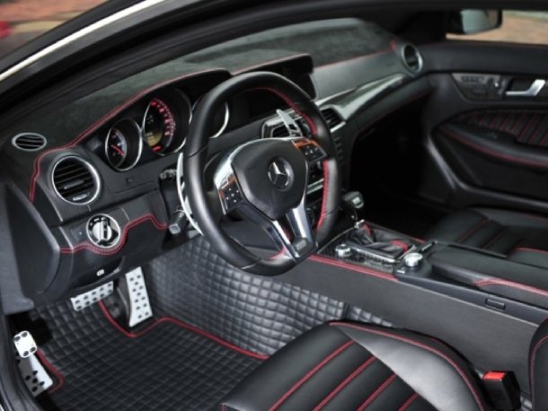 Der V12 versteckt sich beim Bullit Coupé in der Rohkarosserie des C 63 AMG Coupé, das mehr Platz im Motorraum bietet als seine Serienbrüder. Dazu gibt es an der Front eine sportlich-aggressiv gestaltete Schürze mit großen Frischluftzuführern und senkrecht angeordneten Tagfahr-LEDs. Das mittig im Grill angeordnete Brabus-Logo macht im Rückspiegel unmißverständlich klar, dass hier kein normales C Coupé anfliegt. Auf dem Kofferraumdeckel sorgt ein feststehender Heckflügel für zusätzlichen Abtrieb. Ausatmen darf der Zwölfender durch vier Auspuffendrohre, die links und rechts vom Diffusor in der Heckschürze hervorlugen.