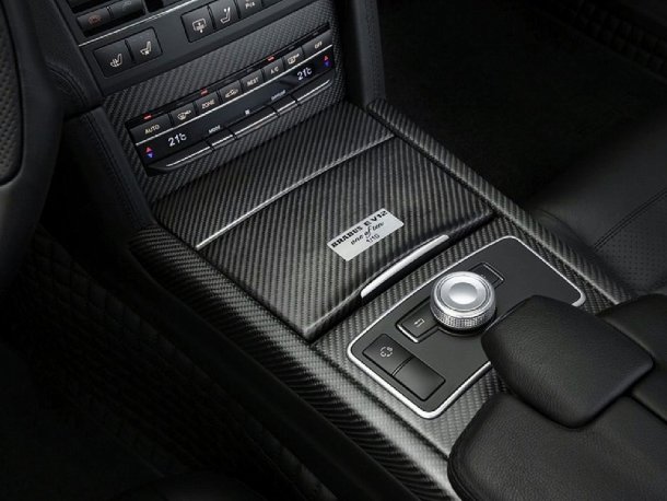 Innen verwöhnt der Brabus E V12 „one of ten“ mit einer Aura aus Leder, Alcantara und Carbon. Um der Sache noch eins draufzusetzen hat Brabus mal eben den kompletten Bodenteppich durch gestepptes Leder ersetzt. Als netten Kontrast zum Dachhimmel aus Alcantara sozusagen. Kleinigkeiten wie eine bis 400 km/h reichende Tachoskalierung, beleuchtete Einstiegsleisten, Aluminiumpedalerie, Einzelsitzanlage hinten und eine silberne Plakette mit Seriennummer vervollständigen das Gesamtpaket.