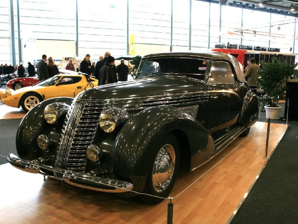 In Halle 5 gab es zwei Sonderschauflächen, eine davon beschreibe ich gesondert im Unterpunkt „100 Jahre Alfa Romeo“. Auf der anderen standen besondere Fahrzeuge, die zum Großteil zum Verkauf angeboten wurden. Sie alle verbindet die Herkunft: Italien. So stand dort ein Alfa Romeo 6C 1750 Grand Sport (GS) mit einer Karosserie von Brichet aus der Schweiz. Dieses Fahrzeug ist damit ein absolutes Unikat und steht sonst in einer privaten Sammlung. Ein 1975er Lancia Stratos in Gruppe 4-Rallye-Spezifikation stand in direkter Nachbarschaft des Alfa und zeigte sich dem Publikum in leuchtendem Gelb. Das Fahrzeug hat eine reiche Rennsportvergangenheit in Rallyes und Bergrennen hinter sich und steht aktuell zum Verkauf. In einem wunderschönen dunkelblau präsentierte sich ein Dino 246 GT mit gerade einmal 65.000 Kilometern auf dem Tacho. Laut Verkäufer stimmen alle Nummern mit den Werksdokumenten überein und auch Lack und Leder sind im Originalzustand. Dies darf man zwar auch vom dunkelrot lackierten Alfa Romeo 6C 2500 Sport Berlina Freccia d’Oro daneben sagen, jedoch wird hier auf den ersten Blick deutlich, dass der Wagen mehr Geschichten erzählen kann. Er wurde 1950 an einen Uhrmacher in der Schweiz ausgeliefert, der ihn 17 Jahre lang behielt und fuhr. Anschließend ging er an einen Sammler, der den 45.000 km gelaufenen Wagen zusammen mit 16 weiteren Oldtimern versteckte. Vor zwei Jahren wurde der Dornröschen-Schlaf dieser Fahrzeuge beendet und heute steht dieser Wagen fahrfertig aber mit ordentlich Patina zum Verkauf. Eine von Pininfarina gezeichnete Lancia Flaminia Limousine sorgte für Erstaunen. Die Optik wurde in großen Teilen vom Prototyp Lancia Florida übernommen, über den Batista Pininfarina einmal gesagt haben soll: „Damit möchte ich in den Himmel fahren.“ Spannend sind Details wie die Form der D-Säulen oder auch gleich zwei Scheibenwischer an der Heckscheibe an einem Auto mit Baujahr 1959. Heimlicher Star der Ausstellungsfläche war jedoch ohne Frage das Lancia Astura Cabriolet mit Boneschi-Karosserie. Dieser Wagen hat 2009 den Concours d’Elegance an der Villa d’Este gewonnen und man kann klar sehen, warum. Das über 6 Meter lange Fahrzeug ist vermutlich das letzte existierende Exemplar der 15 Chassis, die Lancia 1937 baute und von verschiedenen Karosseriefirmen einkleiden ließ.