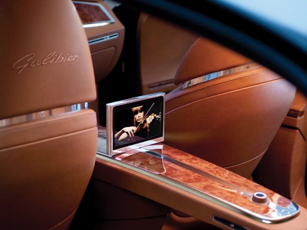 Im Interieur findet sich jeglich erdenklicher Luxus. Das Armaturenbrett ist auf das Notwendigste reduziert und verfügt, wie schon in der letztjährigen Version, über eine herausnehmbare Uhr von Parmigiani Fleurier, die der stolze Besitzer als Armband-, Tisch- oder Taschenuhr nutzen kann. Bereits jetzt wurde ein passgenaues Taschenset für den Galibier vorgestellt.