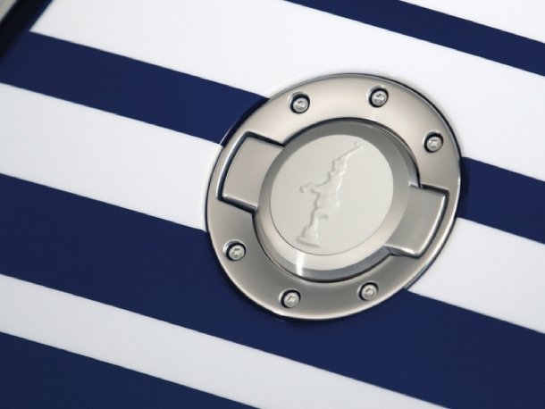 In die Tankdeckel sind Porzellan-Elemente eingelassen, die den stehenden Elefanten von Rembrandt Bugatti zeigen.