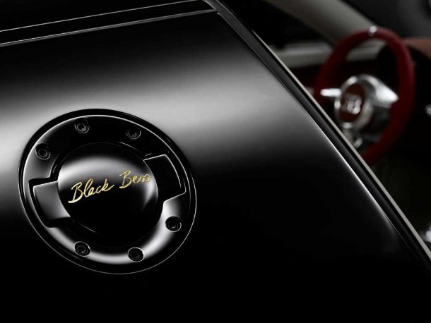 Im Interieur dominiert das hellbeige Leder auf Sitzen und Mittelkonsole, das durch den Havanna-Beigeton des Armaturenbretts gekonnt abgerundet wird. Das Lenkrad erhielt einen Bezug in Carmesin rotem Leder – eine Farbe, die auch in den Ziernähten der Sitze und durch die Sicherheitsgurte wieder aufgenommen wird. Beeindruckend sind die handgemalten Motive des Bugatti Type 18 und der Morane Saulnier Typ H – dem Flugzeug von Roland Garros – die sich auf den Türpaneelen und dem Deckel des Ablagefaches zwischen den Sitzen finden. Durch eine spezielle Tinte und eine neuartige Imprägnierung sind diese Bilder vor Umwelteinflüssen und Abrieb geschützt. Da es sich um Handzeichnungen des Bugatti Chefdesigners Achim Anscheidt handelt, sind alle Paneele der drei Legend Black Bess Fahrzeuge unterschiedlich. Zusätzlich wird an der Mittelkonsole und am Schalthebel edles Rosenholz eingesetzt. Das EB-Logo zwischen den Sitzen ist 24-Karat-vergoldet.