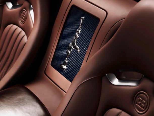 Zugleich als Kontrast und als Aufgriff des Exterieurs dürfen die Elemente in blauem Sichtcarbon gelten, die sich in den Türen und auf dem Deckel des Ablagefaches zwischen den Sitzen finden. Letzteres ist zudem mit einem platinierten Emblem des Tanzenden Elefanten verziert – jenem Symbol, das von Ettores Bruder Rembrandt Bugatti als Skulptur erschaffen wurde und anschließend als Kühlerfigur den Bugatti Type 41 Royale schmückte.