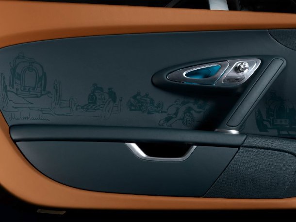 Das Interieur des 1.200 PS starken Supersportwagens ist gänzlich mit Leder bezogen. Windschutzscheibenrahmen, der äußere Bereich der Türverkleidungen, der Innenbereich der Sitze, der untere Bereich des Armaturenbrettes und die Schwellerverkleidung wurden in der Farbe “Gaucho“ ausgeführt, einem warmen Cognac-Ton. Die restlichen Areale tragen Leder in “Lake Blue“ und werden durch Ziernähte in “Bugatti Light Blue Sport“ kontrastiert. In dieser Farbe ist auch die Signatur von Meo Constantini in die Kopfstützen eingestickt worden. Die Mittelkonsole und der Deckel des Ablagefaches zwischen den Sitzlehnen tragen dunkelblau eingefärbtes Sichtcarbon, wobei auf dem Deckel zusätzlich die Streckensilhouette der Targa Florio zu finden ist. In die dunkelblauen Bereiche der Türverkleidungen wurden mit handwerklichem Geschick und höchster Präzision Oldtimer-Motive und Rennszenen aus dem Leben von Constantini gelasert.