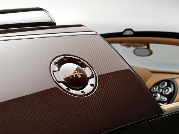 Akzente bilden der Hufeisengrill und das EB-Logo am Heck in Platin sowie die Leichtmetallräder in Noix- und Firefinch-Braun. Auf Tank- und Öldeckel ist die Unterschrift von Rembrandt Bugatti als Gravur zu finden. Cognac-braunes Leder führt im Interieur den edlen Eindruck gekonnt weiter. An den Türverkleidungen und am Windlauf kommt eine aufwändige Flechtledertechnik zum Einsatz, bei der zusätzlich Leder in der Farbe Coffee eingesetzt wird. Auf dem Deckel des Ablagefaches zwischen den Sitzen findet sich eine in Bronze gegossene Nachbildung des tanzenden Elefanten, die in bronzefarbenes Sichtcarbon eingesetzt wurde. Das EB-Logo auf dem Lenkrad besteht aus Platin. Zusätzlich findet sich auf den Einstiegsleisten neben der Signatur auch ein Porträtbild von Rembrandt Bugatti.