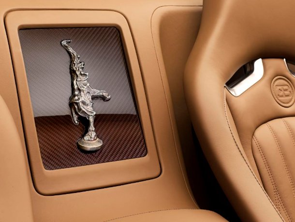 Akzente bilden der Hufeisengrill und das EB-Logo am Heck in Platin sowie die Leichtmetallräder in Noix- und Firefinch-Braun. Auf Tank- und Öldeckel ist die Unterschrift von Rembrandt Bugatti als Gravur zu finden. Cognac-braunes Leder führt im Interieur den edlen Eindruck gekonnt weiter. An den Türverkleidungen und am Windlauf kommt eine aufwändige Flechtledertechnik zum Einsatz, bei der zusätzlich Leder in der Farbe Coffee eingesetzt wird. Auf dem Deckel des Ablagefaches zwischen den Sitzen findet sich eine in Bronze gegossene Nachbildung des tanzenden Elefanten, die in bronzefarbenes Sichtcarbon eingesetzt wurde. Das EB-Logo auf dem Lenkrad besteht aus Platin. Zusätzlich findet sich auf den Einstiegsleisten neben der Signatur auch ein Porträtbild von Rembrandt Bugatti.