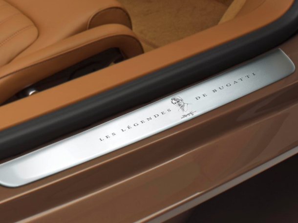Akzente bilden der Hufeisengrill und das EB-Logo am Heck in Platin sowie die Leichtmetallräder in Noix- und Firefinch-Braun. Auf Tank- und Öldeckel ist die Unterschrift von Rembrandt Bugatti als Gravur zu finden. Cognac-braunes Leder führt im Interieur den edlen Eindruck gekonnt weiter. An den Türverkleidungen und am Windlauf kommt eine aufwändige Flechtledertechnik zum Einsatz, bei der zusätzlich Leder in der Farbe Coffee eingesetzt wird. Auf dem Deckel des Ablagefaches zwischen den Sitzen findet sich eine in Bronze gegossene Nachbildung des tanzenden Elefanten, die in bronzefarbenes Sichtcarbon eingesetzt wurde. Das EB-Logo auf dem Lenkrad besteht aus Platin. Zusätzlich findet sich auf den Einstiegsleisten neben der Signatur auch ein Porträtbild von Rembrandt Bugatti.