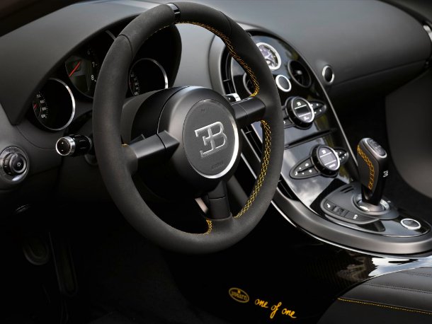 Außerdem findet sich das „Macaron“ genannte Oval auch in gelber Ziernaht auf den Kopfstützen der Sitze. Die gelben Kontrastnähte verzieren auch das Lenkrad und den Wählhebel des DSG-Getriebes sowie die Außenkante von Sitzen und Mittelkonsole. Als Dekor für die Mittelkonsole wählte der Kunde das tiefschwarz eingefärbte Sichtcarbon, das auch schon außen zu sehen ist. Sämtliche Lederbezüge sind ebenfalls in Tiefschwarz gehalten. Auf dem Deckel des Ablagefaches zwischen den Sitzen wurde mit gelber Farbe auf schwarzem Sichtcarbon eine Skizze vom Bugatti Type 35 aufgetragen. Dieser Wagen gehört bis heute zu den erfolgreichsten Rennwagen aller Zeiten, da mit ihm mehr als 2.000 Rennsiege und Podiumsplatzierungen eingefahren wurden. Ein weiteres neues Detail sind die Türpaneele, bei denen eine neuartige Laserperforationstechnik zum Einsatz kam. Mit ihr wurde eine stilisierte Seitenansicht des Veyron Grand Sport Vitesse in schwarzes Leder eingearbeitet. Dahinter wurde gelbes Leder gespannt, das nun durch die Löcher hindurchschimmert.
