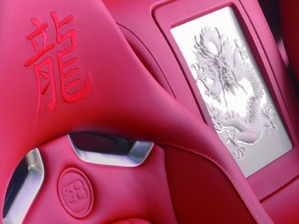 In die Kopfstützen ist das Schriftzeichen für "Drache" eingestickt. Zwischen den Sitzen ist eine große Porzellantafel mit einem Drachenrelief integriert.